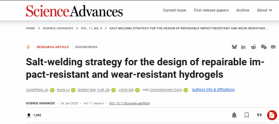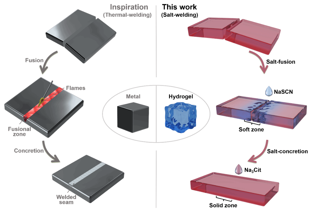 如同哪吒的金刚不坏之身要在三昧真火里定型,为了加快材料的修复,科学家们通常采取高温加热或者光照,这给一些实际应用中的操作带来了不便。最近,宁波大学的研究者发现了一类高分子水凝胶具有“时盐等效”现象(Macromolecules 2024, 57, 2746),它的分子在某些盐的作用下可以加速运动使得材料变得像水一样柔软,在某些盐的作用下又可以凝聚起来使得材料变得像塑料一样坚硬。基于此,研究团队提出了“盐焊接水凝胶”,仅需在室温下的盐溶液中简单浸泡95分钟,就使得水凝胶恢复了23 MPa的断裂强度,超越了同类型材料的修复速率。相关成果发表在Science Advances(Science Advances 2025, 11, eadr9834)。
